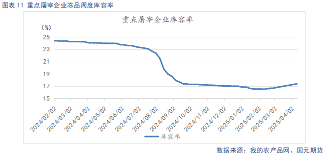 2.3 消费一会儿断档期 屠企开工率回落 截止4月15日,要点宰杀企业开工率为26.89%,较上周下降0.6%。冷冻肉库容率17.38%,较上周环比上升0.12%。刻下正处于爽直、五一间的消费断档期,家庭及餐饮消费疲弱,白条走货不畅,屠企在耗损压力下,以销定宰,开工率小幅回落。刻下市集冻肉需求偏淡,且屠企有主动分割入库操作,冻肉库存执续小幅回升。