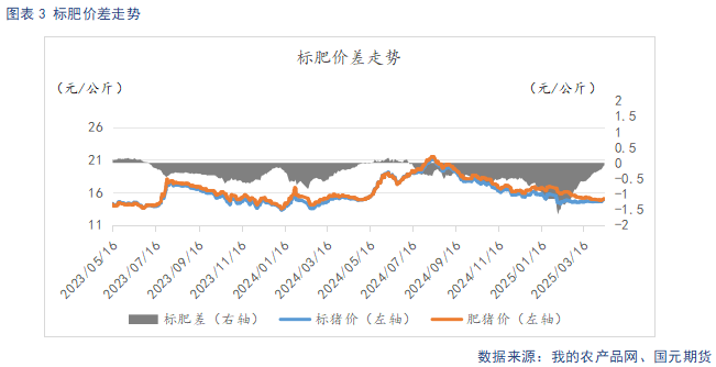 生息端缩量出栏,重叠上周朔方大部受极点天气影响,调运受阻,猪价上破窄幅波动区间。盘面上看,主力合约换月至2509,算作旺季合约,市集对三季度需求存有预期,远月合约阐明较为强势。 二、生猪基本面分析 2.1 标肥价差渐渐确立 猪价破位上行 截止4月15日,生猪出栏均价14.95元/公斤,较上周环比高潮0.36元/公斤。标肥价差-0.08元/公斤,较上周环比缩窄0.15元/公斤。在宏不雅战略提振,以及市集对后市需求增量存有预期,生息端挺价压栏,重叠大风降温天气影响生猪调运,猪价短期进取破位。不外跟着气温渐渐回升,大猪需求受限,标肥价差渐渐确立,刻下大猪执续累库,后续供给有进一步开释压力。 截止4月15日,仔猪出栏均价42.13元/公斤,较上周环比下落0.12元/公斤。市集看好三季度,补栏积极性加多,市集交投转好,近期跟着价钱执续回升,补栏积极性有所降温,价钱窄幅回落。